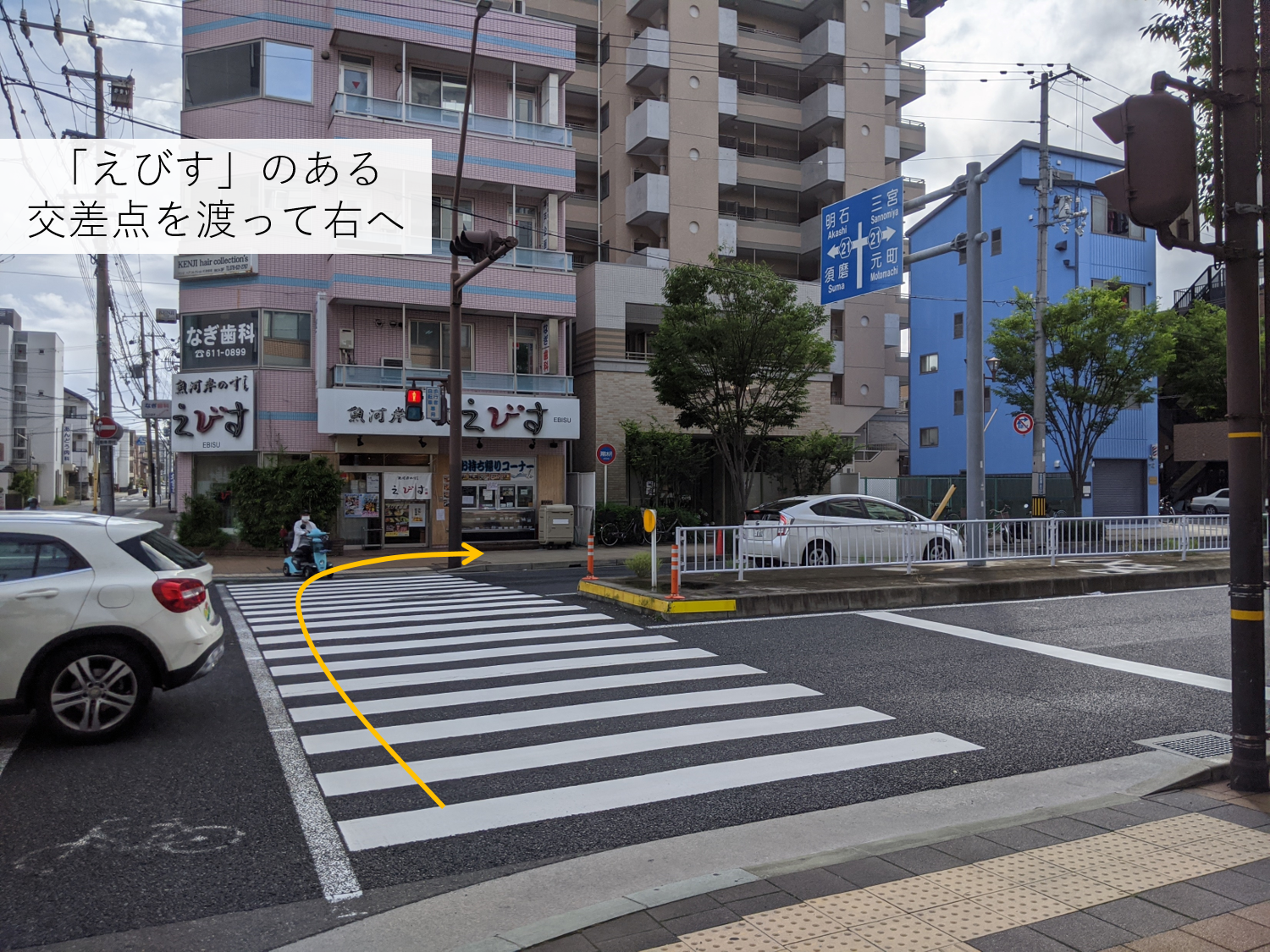 みなと銀行やファミリーマートの前を通って、約300mほど進みます。 道の反対側に「魚河岸すし えびす」が見えたら反対側に渡りましょう。