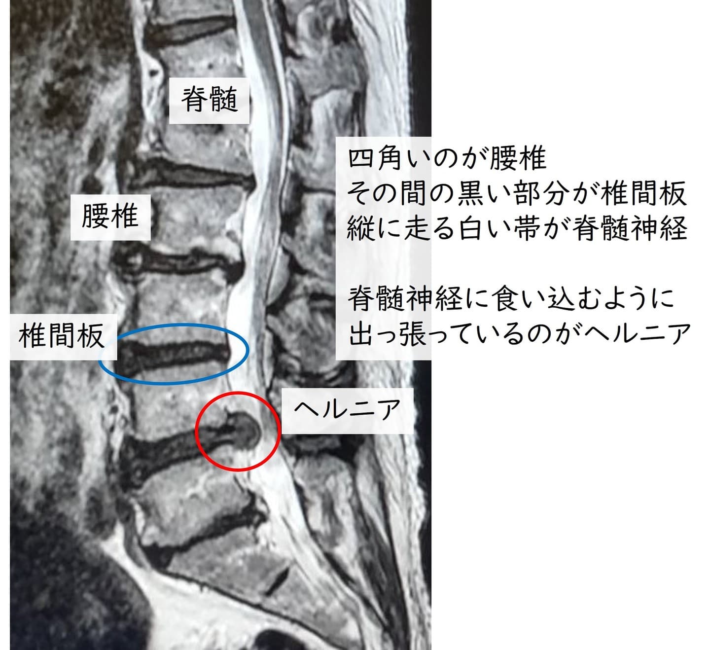 挟まれて黒く映っている(青い丸)のが椎間板。
