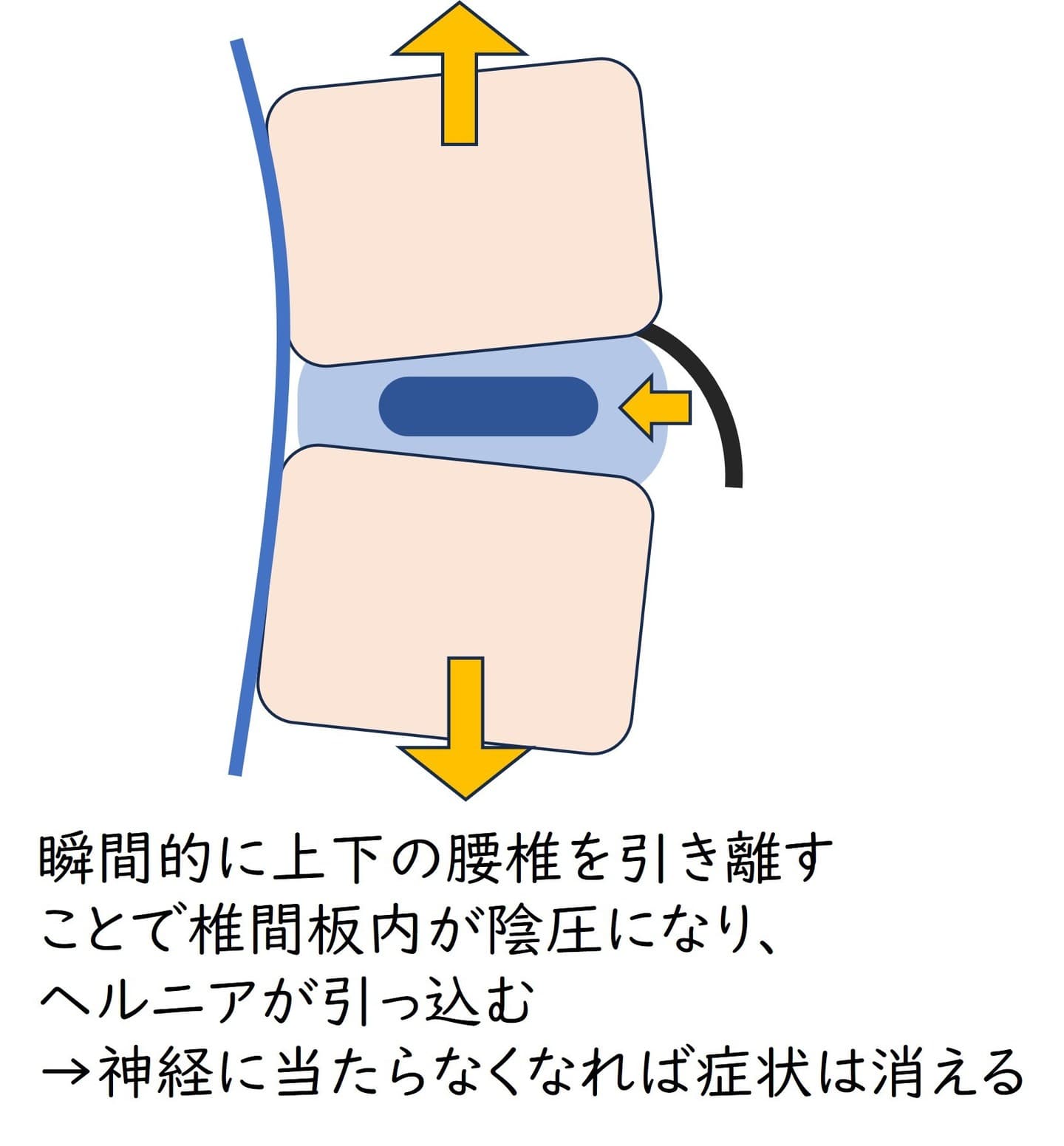 その逆、上下の腰椎を引き離すように瞬間的に矯正!