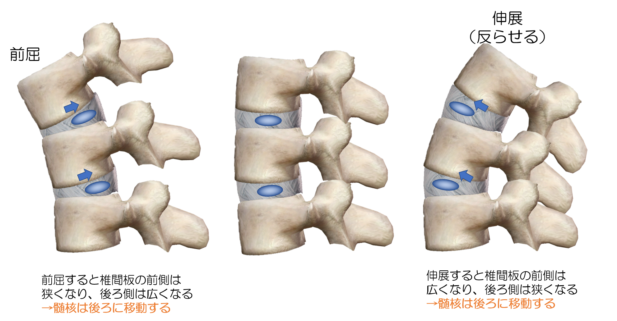 逆に腰を伸ばした(後屈)とき、椎間板は前に移動します。