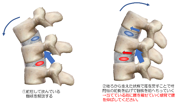 腰椎を下から支えた状態(青矢印)でゆっくりと