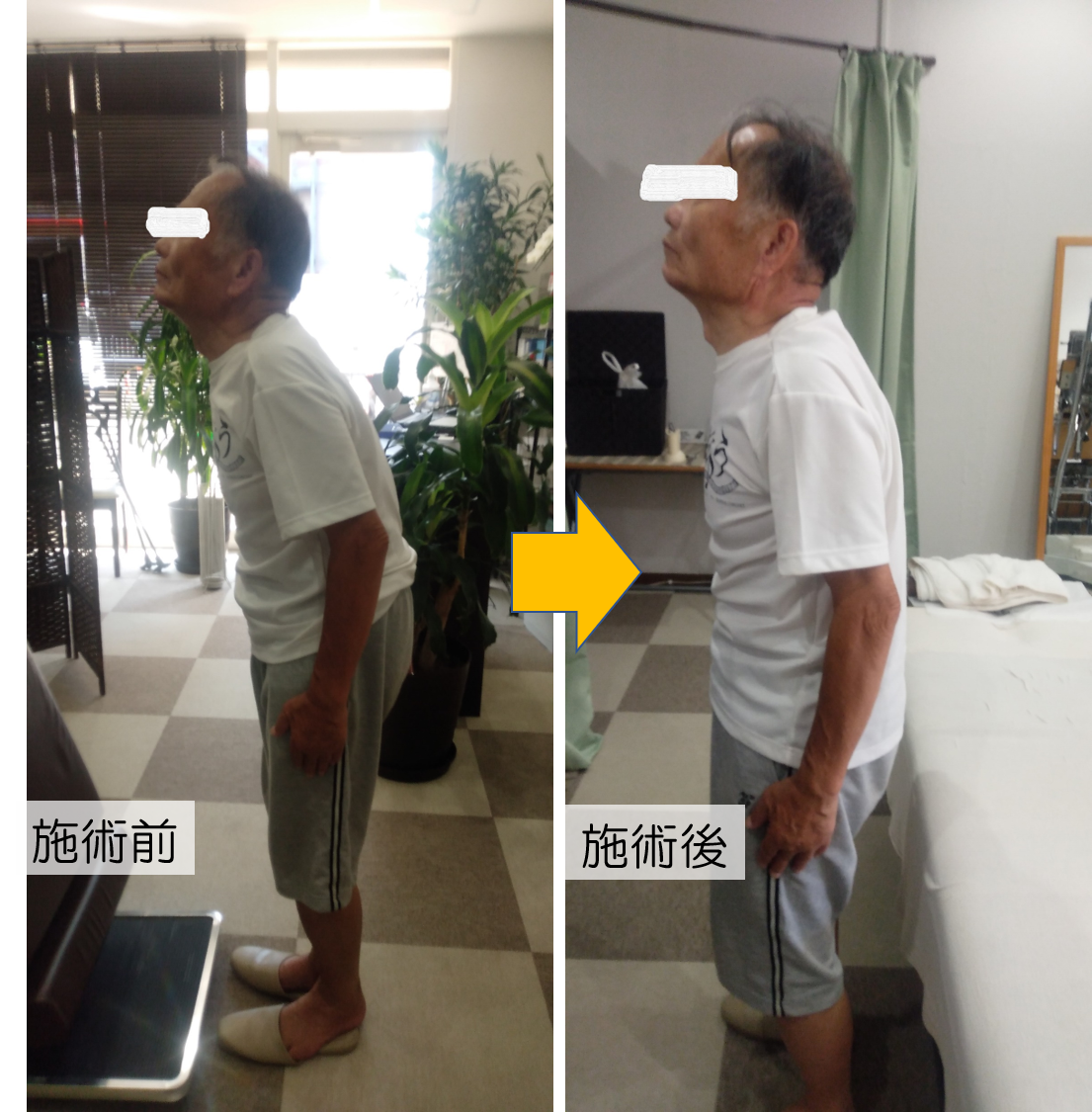 この男性の場合は腰が丸くなった状態で固まっていて、施術前は上半身が前に倒れてしまっています。